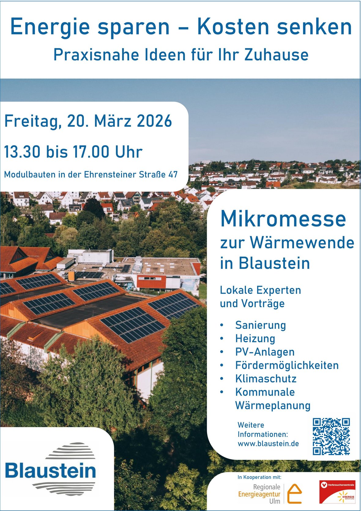 Die Stadt Blaustein veranstaltet gemeinsam mit der Regionalen Energieagentur am Freitag, 20. März 2026 zum ersten Mal eine Mikromesse zur Wärmewende in den Modulbauten auf dem Lixgelände (Ehrensteiner Straße 47). Von 13:30 bis 17:00 Uhr können sich Interessierte bei verschiedenen regionalen Ausstellern und Energieberatern über praxisnahe Ideen zu energetischen Sanierungsmöglichkeiten, moderne Heizlösungen, PV-Anlagen sowie Fördermöglichkeiten informieren. Vorträge geben zusätzlich wertvolle Impulse in diesen Bereichen. Die Stadt Blaustein präsentiert außerdem ihre Arbeit in den Bereichen Kommunale Wärmeplanung und Klimaschutzmanagement. Der Eintritt zur Messe ist frei.