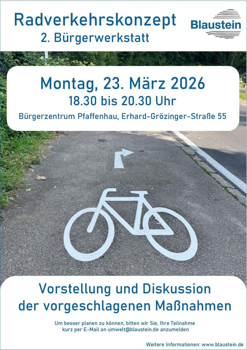 Die Stadt Blaustein erarbeitet seit Anfang 2025 in Zusammenarbeit mit dem Planungsbüro VIA ein Radverkehrskonzept. Ziel ist es, ein zusammenhängendes, durchgängig gut befahrbares Radverkehrsnetz zu schaffen, um die Attraktivität der Radrouten bzw. des Fahrrads als Verkehrsmittel zu steigern. Gleichzeitig soll die Verkehrssicherheit erhöht und Radverkehrsunfälle vermieden werden. Das Konzept soll nicht nur überzeugte Radfahrende erreichen; auch Menschen, die aktuell ganz selbstverständlich Auto fahren, sollen sich angesprochen fühlen.